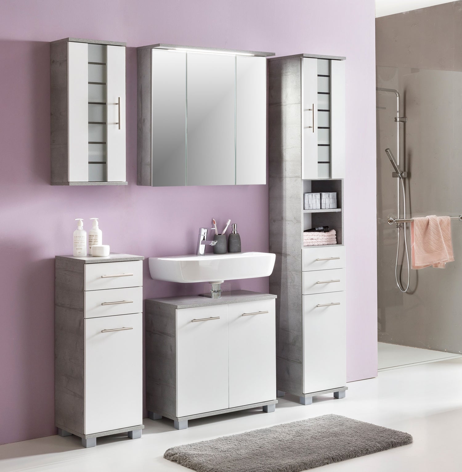 Das Wandregal Nitro ist die perfekte Ergänzung für moderne Badezimmer und überzeugt mit einer klaren, geradlinigen Optik. Die Kombination aus heller Betonoptik und weißem Dekor setzt einen stilvollen Akzent und bringt Leichtigkeit in den Raum. Durch das offene Design bietet das Regal Platz für dekorative Accessoires, Pflegeprodukte oder kleine Badutensilien – alles ist schnell griffbereit und gleichzeitig ansprechend präsentiert.